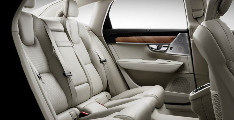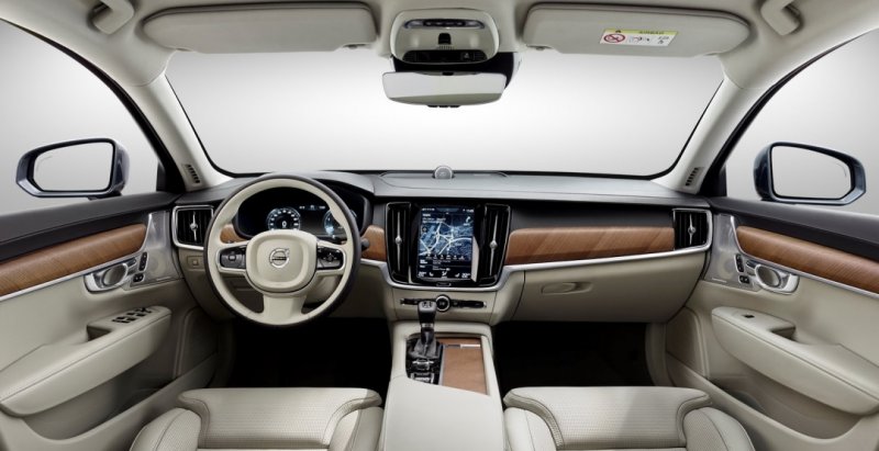 Плюс ко всему, седан имеет вертикальную решётку радиатора. Визуально, новый автомобиль стал шире и длиннее предшественника. Кроме того, шведская новинка может стать самым большим автомобилем в своём сегменте. В салоне нового флагманского седана Volvo S90 можно обнаружить простой, но функциональный интерьер. На центральной консоли расположен большой сенсорный монитор информационно-развлекательной системы Sensus Connect, при помощи которого можно управлять многими функциями автомобиля. Кроме того, в отделке интерьера седана Volvo S90 использовано большое количество натуральной кожи и алюминия.