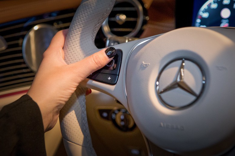 Вместо кнопок и джойстиков на спицах баранки — пара сенсорных тачпадов: меню бортовой системы листается привычными «смартфонными» движениями больших пальцев! При этом можно выбрать один из трёх режимов, чтобы назначить нужную чувствительность. Сенсорным сделан и манипулятор, расположенный поверх привычной шайбы системы Comand: касаниями можно перемещаться по меню, «кликать», пролистывать страницы и писать буквы.
