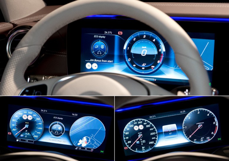 Менять оформление приборов позволяют многие автомобили. Но, например, у новой «семёрки» BMW от режима фактически зависит только колеровка. И даже расположение циферблатов не меняется, поскольку их ободки настоящие. У «Мерседеса» — совершенно другая история! Стили Classic, Sport и Progressive настолько сильно отличаются друг от друга, что создают впечатление действительно разных машин: от «тёплого лампового» олдтаймера до хайтечного концепта.