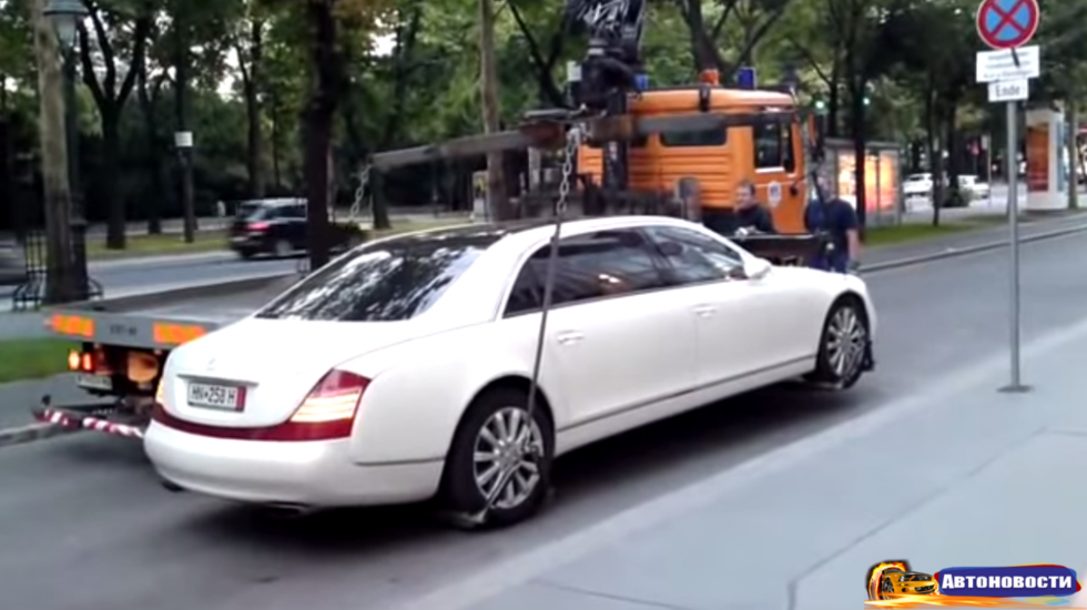 Новые “Майбахи”, быть может, очень и очень хороши, но пары-другой сотен килограммов им явно не хватает. Зачем они им? Ну как же – спасать владельца от хлопот со штрафстоянками и сопутствующими бедами. Такая скрытая опция, ага. В общем, герой сегодняшнего ролика – старина Maybach 62S – устроил недавно в Австрии настоящее камеди. Чуть желтушное, но оттого не менее интересное – 2,8-тонный лимо длиной в 6 с лишним метров злостно пошутил над эвакуаторщиками, пытавшимися стибрить его за неправильную парковку. Как в уже поняли, ничего у ребят не вышло...