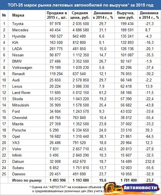 Из отечественных производителей в ТОП-10 оказалась только Lada (126,1 млрд руб.), которая по объему выручки занимает пятое место, потеряв 20% от результата 2014 года. Стоит отметить, что 67% от всей выручки на российском рынке за 2015 год приходится на первую десятку брендов, куда входят Toyota, Mercedes, Hyundai, Kia, Lada, Nissan, BMW, Volkswagen, Renault, Audi.