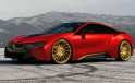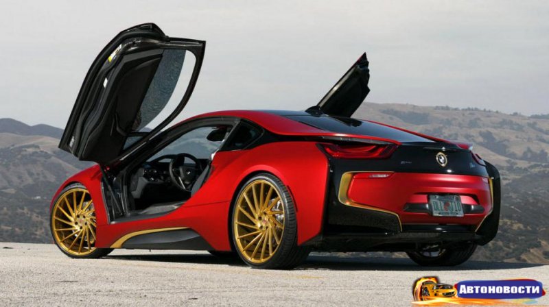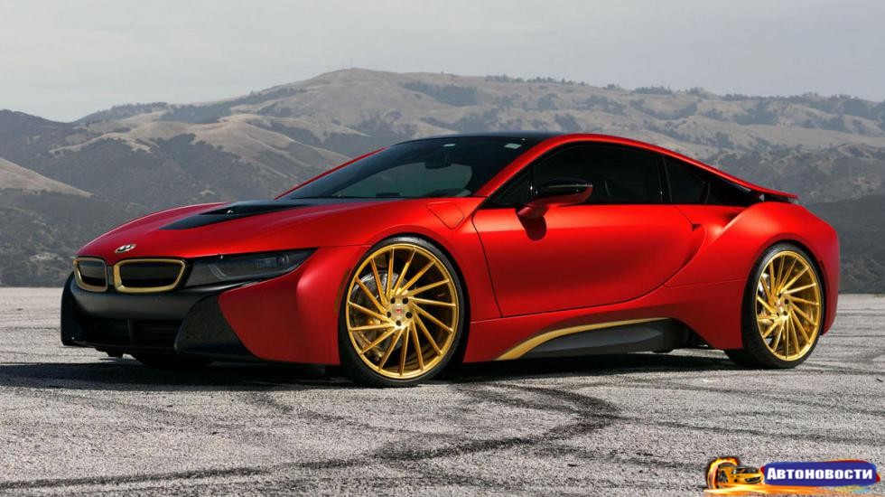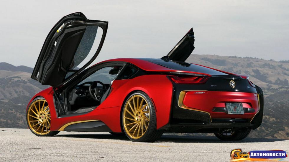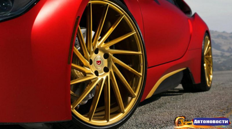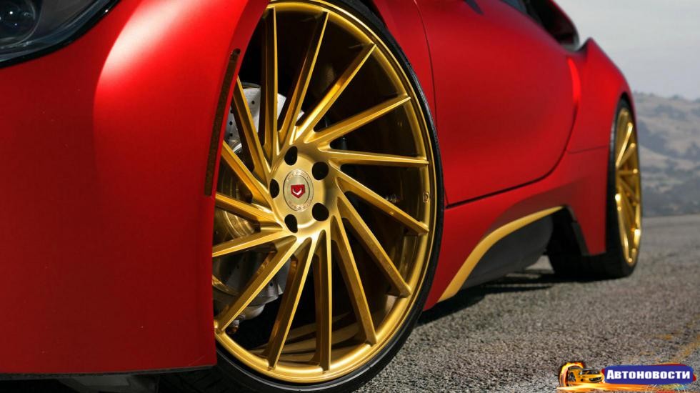 Вы уже поняли, из-за какого Тони была выбрана красно-золотая схема. i8 она идет, а? И черный глянец к месту. Отдельного упоминания заслуживают колеса — спецы Vossen обули двухдверку в 22-дюймовые кованые VPS-305t.