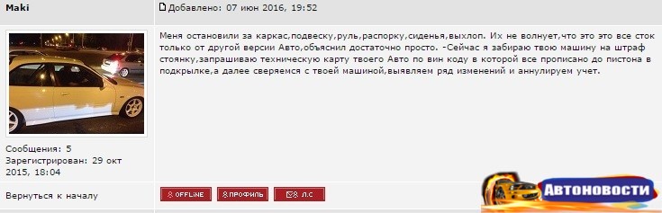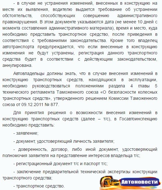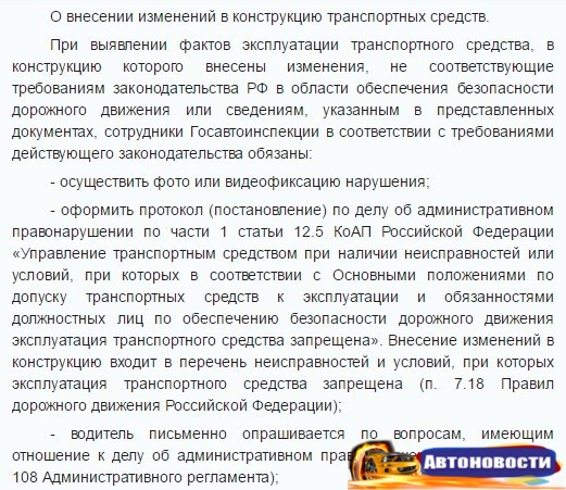 У вашего автомобиля есть доработки, которые можно назвать «вмешательством в конструкцию»? Да 2934 (41%) Нет 3892 (55%) Не знаю 279 (4%) сайте Таможенного союза. Аналогичные рейды в последние дни проводятся в некоторых районах Москвы — в первую очередь, Юго-Западном. Там, где расположена смотровая площадка МГУ, на которой по вечерам обычно собирается «золотая» и простая молодежь на спорткарах и разного рода тюнинговых машинах. К слову, с этого же места начались недавние гонки с полицией сына вице-президента «Лукойла» Руслана Шамсуарова, которые сначала привели к публичному унижению полиции, а затем — к 15 суткам ареста самого Руслана. Являются ли действия московской и камчатской ГИБДД региональной инициативой или это новая политика российской госавтоинспекции, до сих пор смотревшей на тюнинг сквозь пальцев, пока неясно. Необходимо напомнить, что юридические основания для борьбы с самовольными вмешательствами в конструкцию авто у ГИБДД были всегда, как минимум — с момента вступления в силу техрегламента «О безопасности колесных транспортных средств» 2010 года. И рейды по выявлению таких машин иногда проводились в разных регионах страны. Так, осенью 2011 года ГИБДД после очередной крупной аварии с жертвами начала отлов «заниженных Приор» в Дагестане. Стало ли после этого меньше таких машин на улицах российских городов? Сообщения в соцсетях и на форумах о рейдах полиции против тюнинга в Москве Сообщения в соцсетях и на форумах о рейдах полиции против тюнинга в Москве Сообщения в соцсетях и на форумах о рейдах полиции против тюнинга в Москве Разъяснение ГИБДД Камчатского края по вопросу Разъяснение ГИБДД Камчатского края по вопросу Разъяснение ГИБДД Камчатского края по вопросу Скан бумаги ГИБДД по Москве, в которой говорится о ежедневном отлове автомобилей с самовольными изменениями в конструкции. Подлинность бумаги остается под вопросом