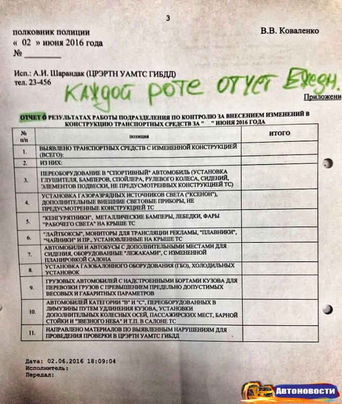 Скан бумаги ГИБДД по Москве, в которой говорится о ежедневном отлове автомобилей с самовольными изменениями в конструкции. Подлинность бумаги остается под вопросом