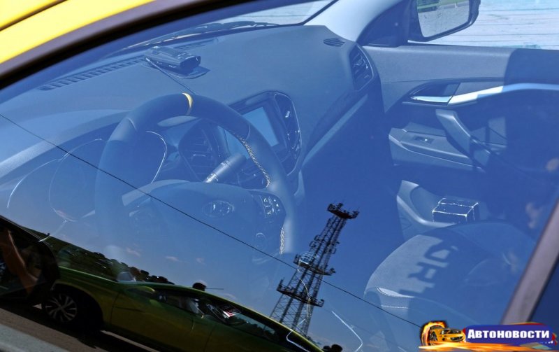 Салон заснять удалось только через закрытое стекло, но даже таким образом видно как минимум одно отличие от стандартной Весты — кожаную оплетку руля со спортивной «насечкой» наверху.