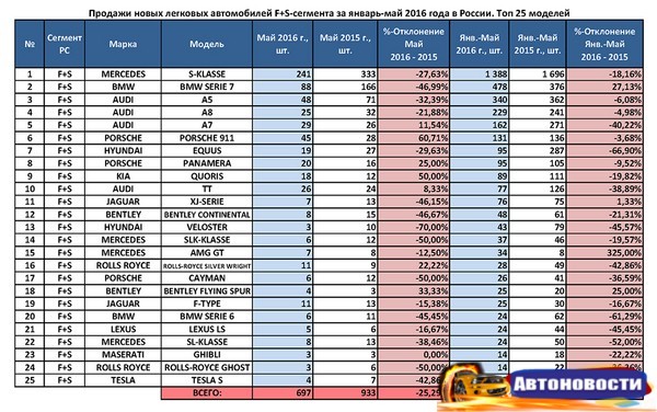 В мае 2016 г. объем рынка люксовых автомобилей в России составил 697 единиц, сообщает аналитическое агентство «Автостат-Инфо». Эта цифра на 25,3% меньше аналогичного показателя 2015 года. Всего за пять месяцев нынешнего года россияне приобрели 3699 люксовых автомобилей, что на 21% меньше, чем годом ранее.