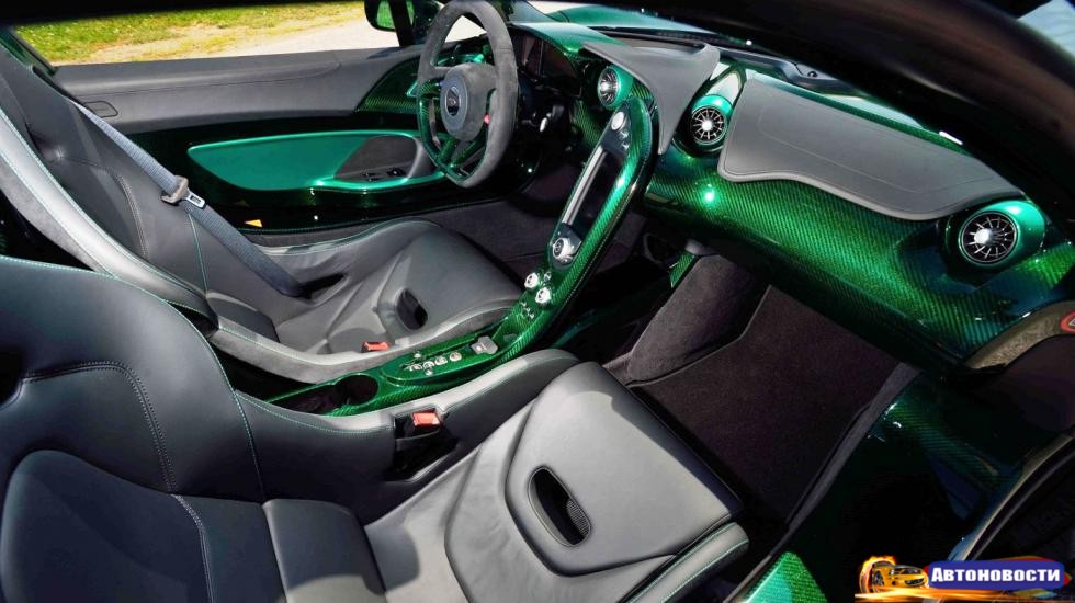 В тон кузову первый владелец этого P1 пожелал выполнить колеса, а также примерно половину салона — в темо-сером колере остались только часть передней панели, элементы руля и сиденья. Начинка, ясное дело, осталась в стоковом виде, хотя карбоновая крышка 3,8-литрового V8 тоже получила сами-знаете-какой-цвет.