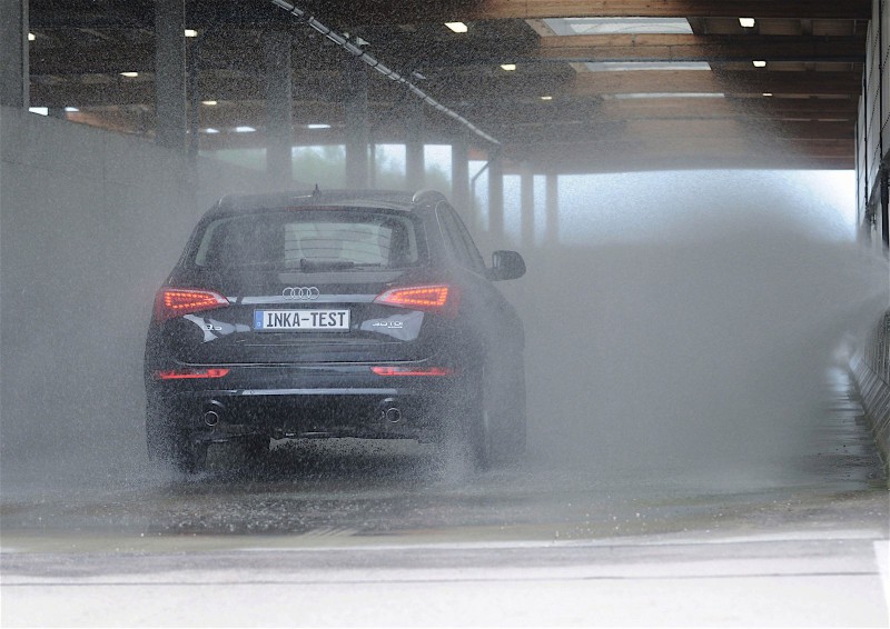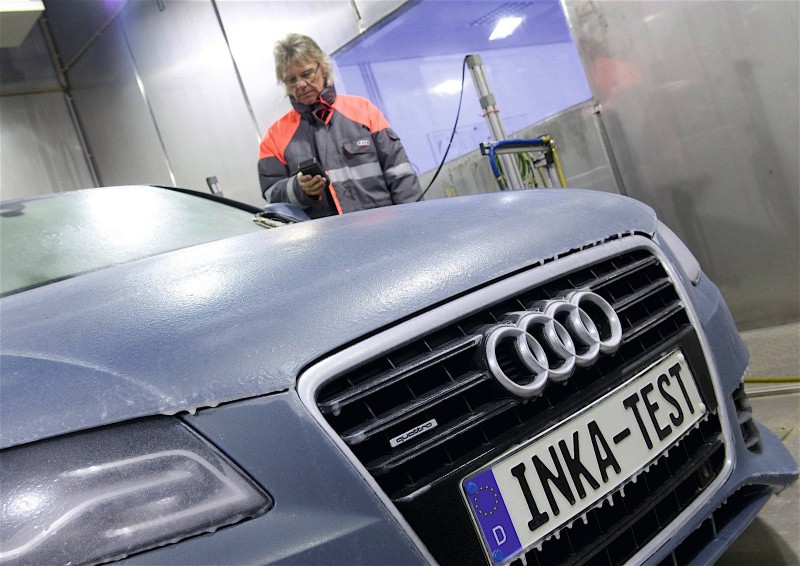 Как рассказывают в Audi, тест INKA разделен на пять этапов. Один из них включает солевой туман в климатической камере при температуре до 35 градусов Цельсия. После осмотра автомобиль попадает в тренажер тропического климата, где жара достигает 50 градусов, в то время как влажность поддерживается на максимальном уровне 100 %. Следующий этап испытывает автомобиль светом, якобы солнечным — 80 галогенных ламп мощностью 1 200 ватт нагревают кузов до 90 градусов по Цельсию.