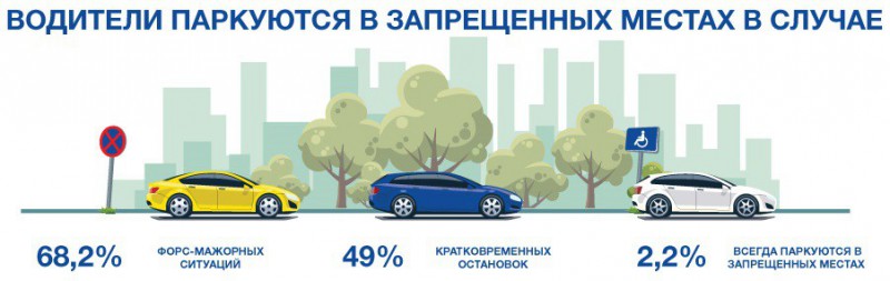 Организаторы исследования также спросили респондентов о причинах, заставляющих их нарушать правила и оставлять автомобили на местах для стоянки транспортных средств водителей-инвалидов.Результаты опроса показали, что 68,2% водителей могут занять специальное место на парковке только в форс-мажорных ситуациях, а 49% опрошенных готовы поступить так в случае кратковременной остановки. Тогда как 2,2% респондентов отметили, что даже без насущной необходимости, к сожалению, всегда паркуются в специально отведенных местах для водителей с ограниченными возможностями.