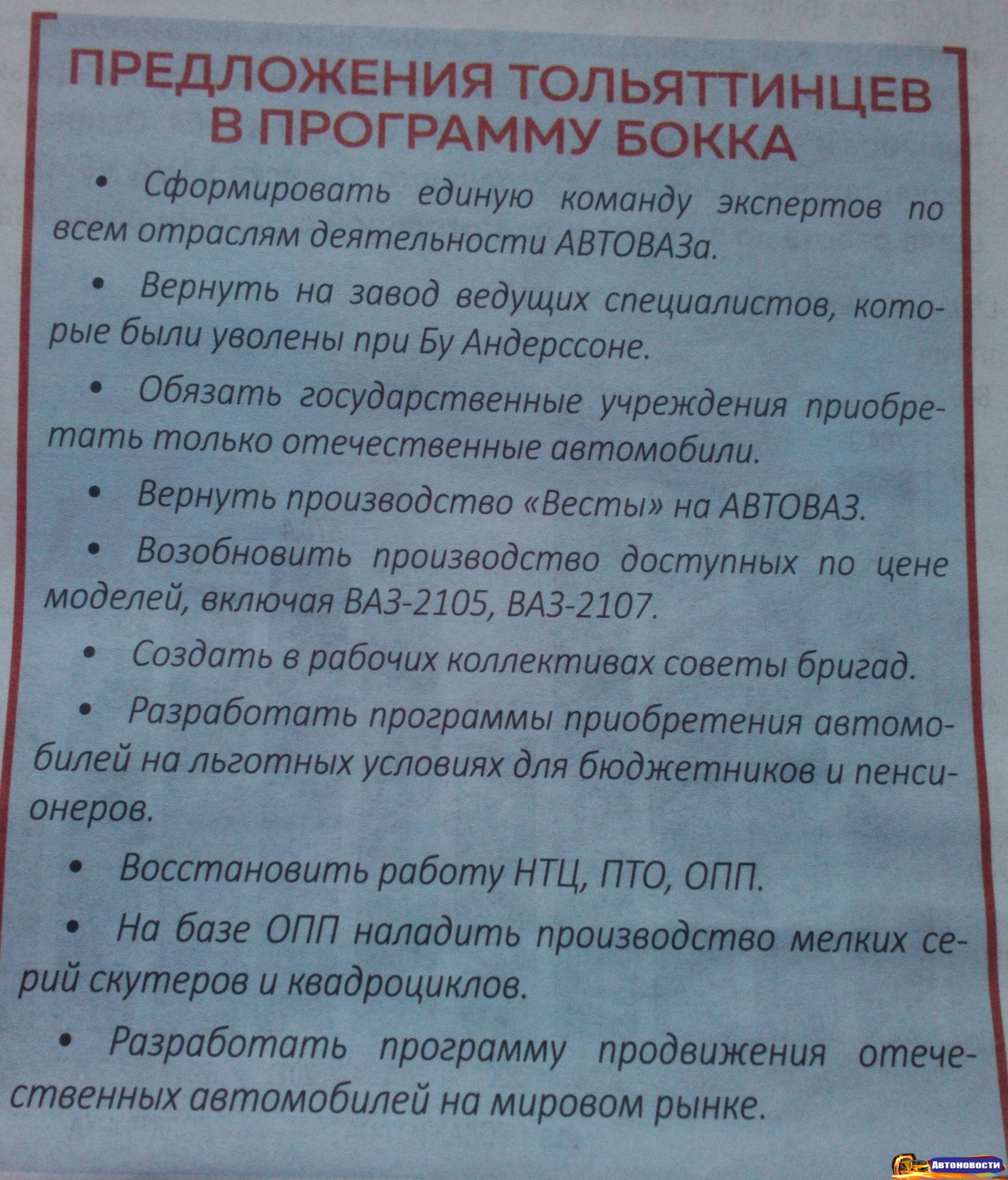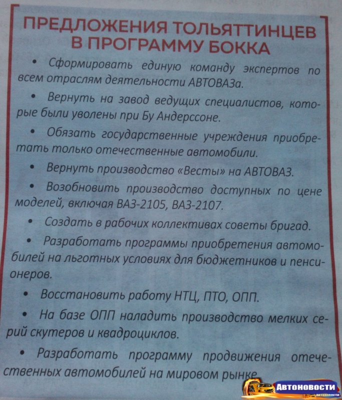 Если верить политику, помимо этого тольяттинцы попросили его «вернуть на завод ведущих специалистов, уволенных при Бу Андерссоне», «вернуть производство «Весты» на «АвтоВАЗ» (сейчас она выпускается на «Иж-Авто»), «создать на базе закрытого Опытно-промышленного производства «АвтоВАЗа» производство скутеров и квадроциклов» и т.п. Как такие просьбы соотносятся с позицией депутата Госдумы РФ, на которую метит Бокк — непонятно.