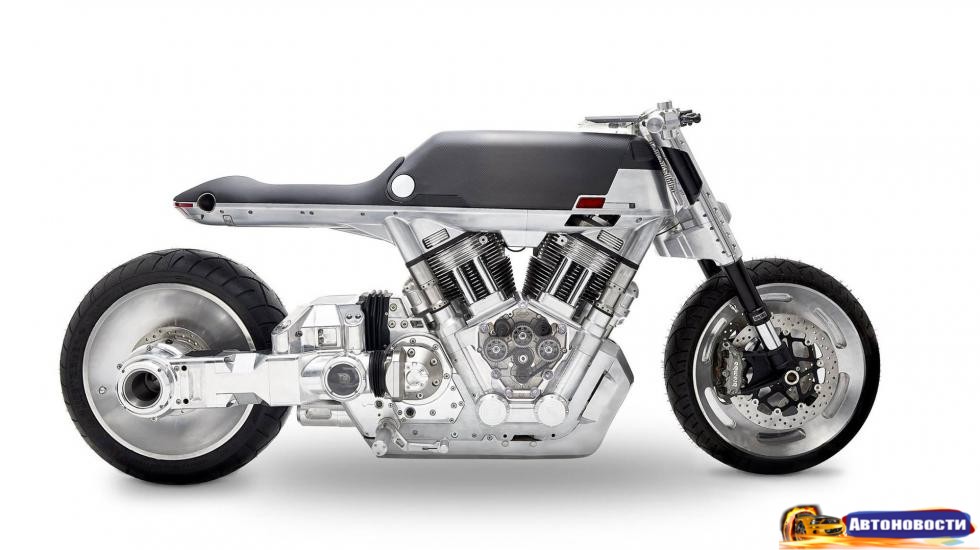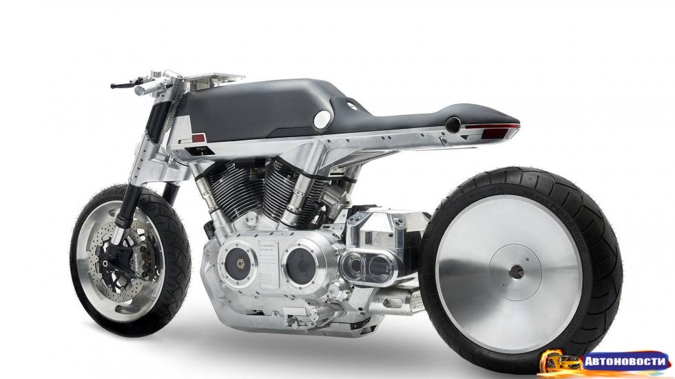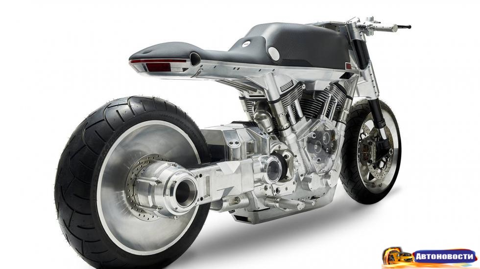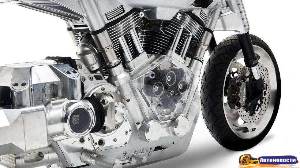Спецы, наверное, тут же раскритикуют этот бездушный кусок железа. Объяснят, чем созданный в Бруклине монстр будет уступать традиционным чоперам. А нам нравится! Эдакий железный дровосек с V-образным двигателем воздушного охлаждения S&S объемом 1917 кубических сантиметров. Двигатель, по сути, и лежит в основе силового каркаса. Он тут, похоже, выступает в качестве рамы, к которой крепятся задний односторонний маятник и элементы подвески. Даже глушитель залег где-то снизу, не сразу и заметишь.