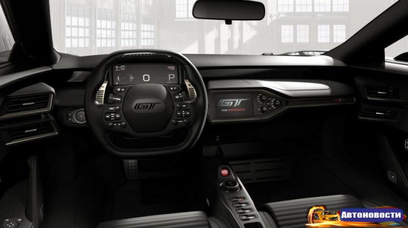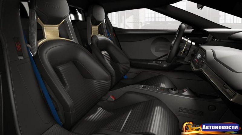 Есть кое-что интересное в салоне. Например, легкие сиденья с карбоновой основой и отделкой кожей, синие ремни безопасности опять же в духе того самого GT40 Mark II, а также карбон на руле, акценты в тон колесам и табличка с индивидуальным номером автомобиля.