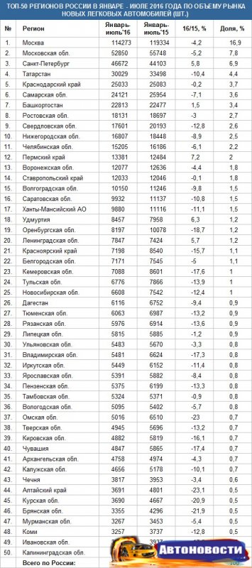 На третьем месте - Санкт-Петербург. За первые семь месяцев нынешнего года в этом городе было продано 46,7 тыс. легковых автомобилей. Эта цифра на 5,8% больше, чем годом ранее. Четвертую строчку занимает Татарстан (30 тыс. шт.; -10,4%). Пятерку лидеров замыкает Краснодарский край, где с начала 2016 г. было реализовано 25 тыс. автомобилей (-0,2%).