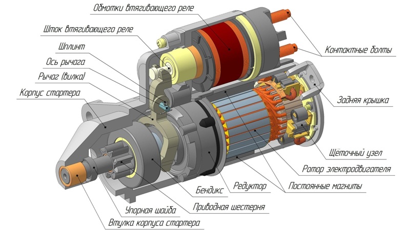 Конструктивно агрегат представляет собой электродвигатель постоянного тока, оснащенный втягивающим реле и приводом с обгонной муфтой (бендиксом). При повороте ключа зажигания или нажатии кнопки Start сигнал поступает на втягивающее реле. Оно выдвигает шестерню стартера, которая входит в зацепление с венцом маховика, и одновременно подает питание на электродвигатель. После запуска ДВС стартер автоматически отключается и выходит из зацепления.