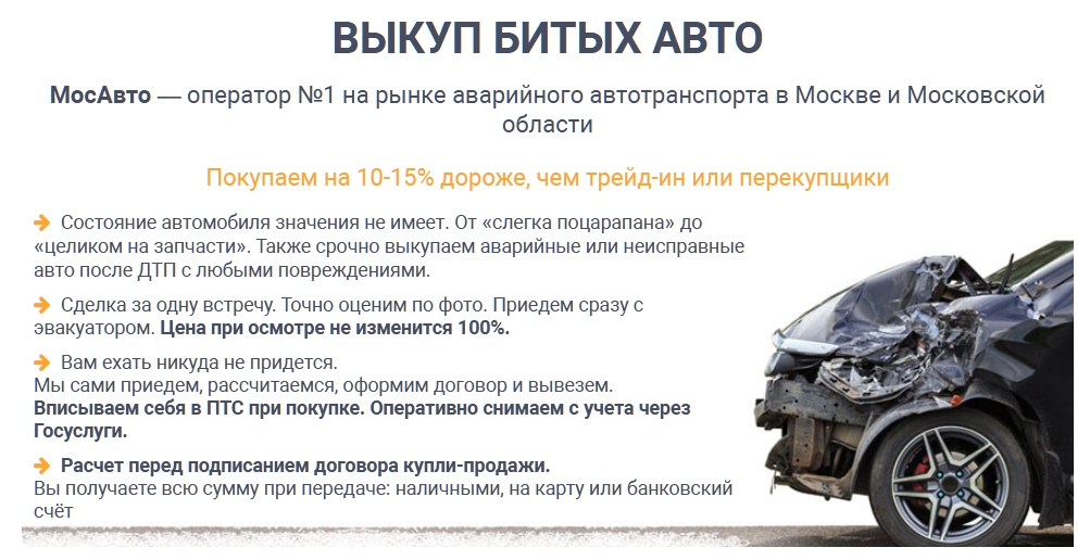 Мы сразу вписываем вас в ПТС при покупке автомобиля. Затем оперативно снимаем транспортное средство с учёта через портал Госуслуги. Расчёт производится до подписания договора купли-продажи. Вы получаете всю сумму сразу при передаче машины — наличными, на карту или на банковский счёт. «Мос-Авто» — одна из немногих компаний, которая занимается скупкой аварийных и битых автомобилей, зарабатывая на их восстановлении, а не перепродаже. Мы работаем с любыми марками и моделями, обеспечивая максимальный комфорт и безопасность сделки.