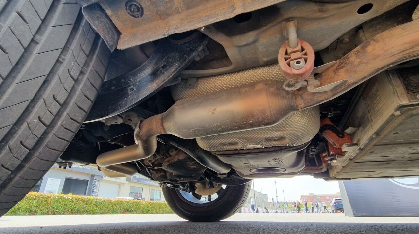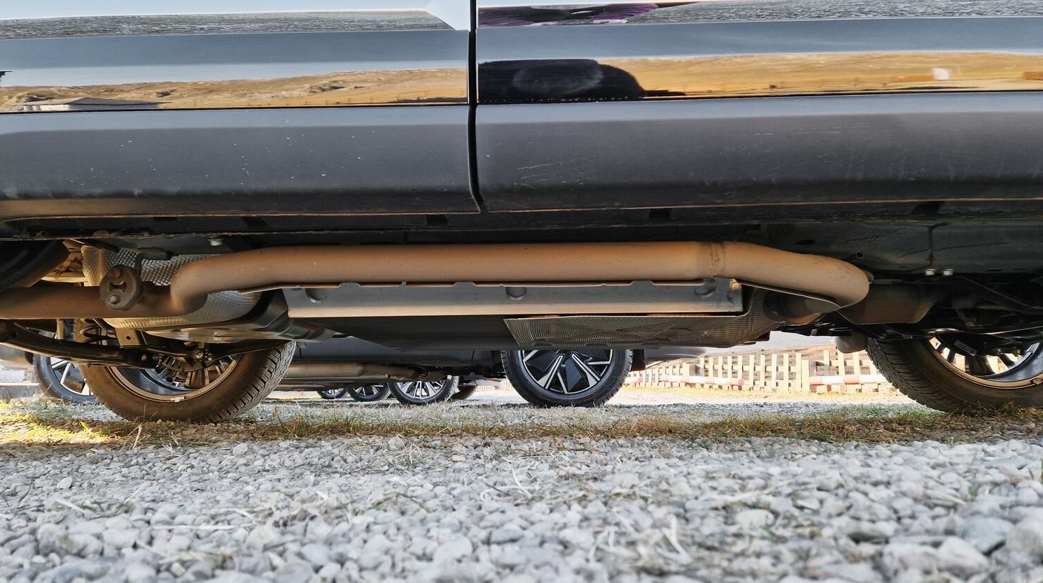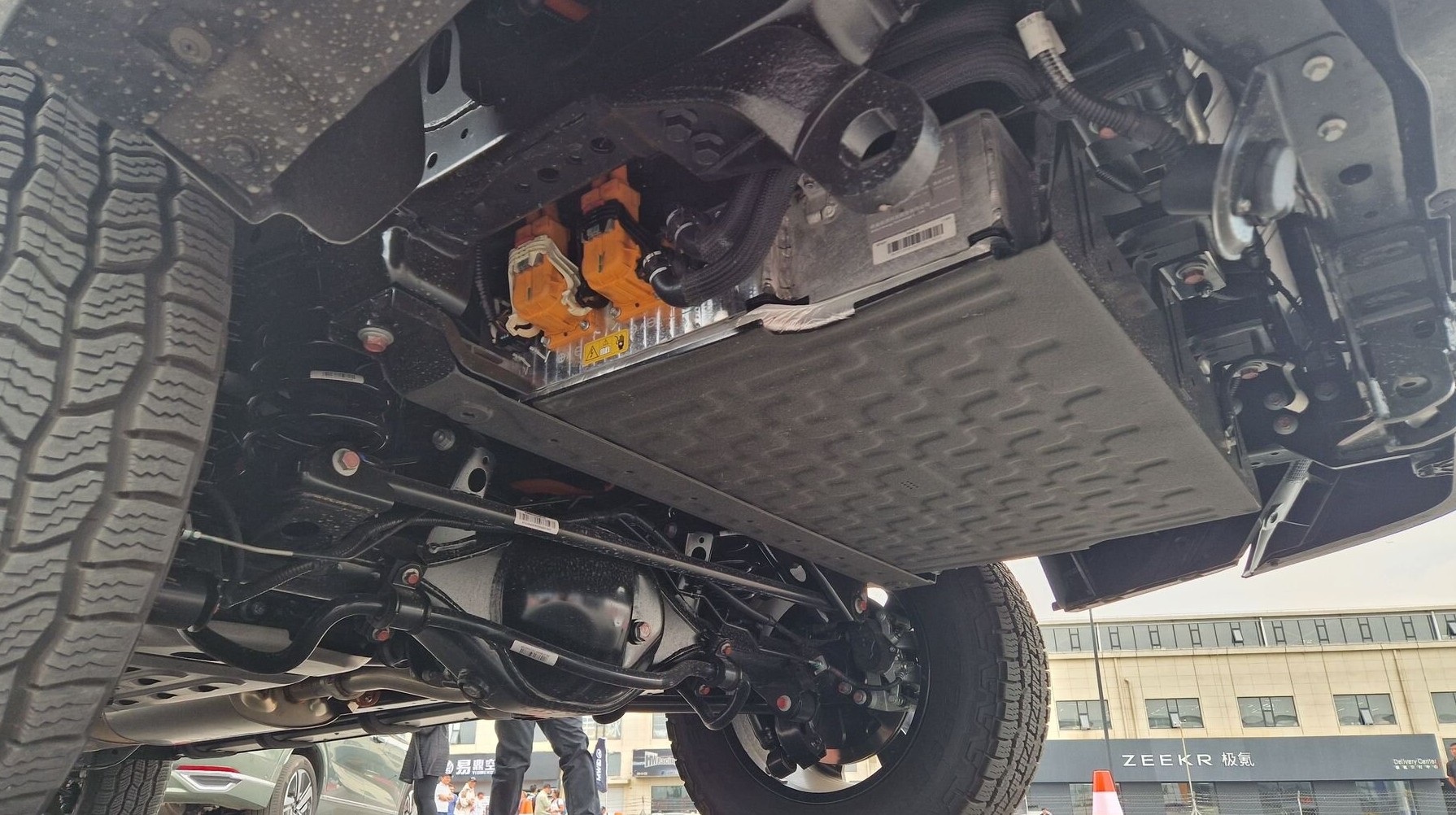 А это — «подбрюшье» китайского кроссовера Haval Raptor: выхлопной тракт тут, как видно, тоже идет вокруг батареи. Но вместо карданной передачи задние колеса приводятся расположенным там электромотором
