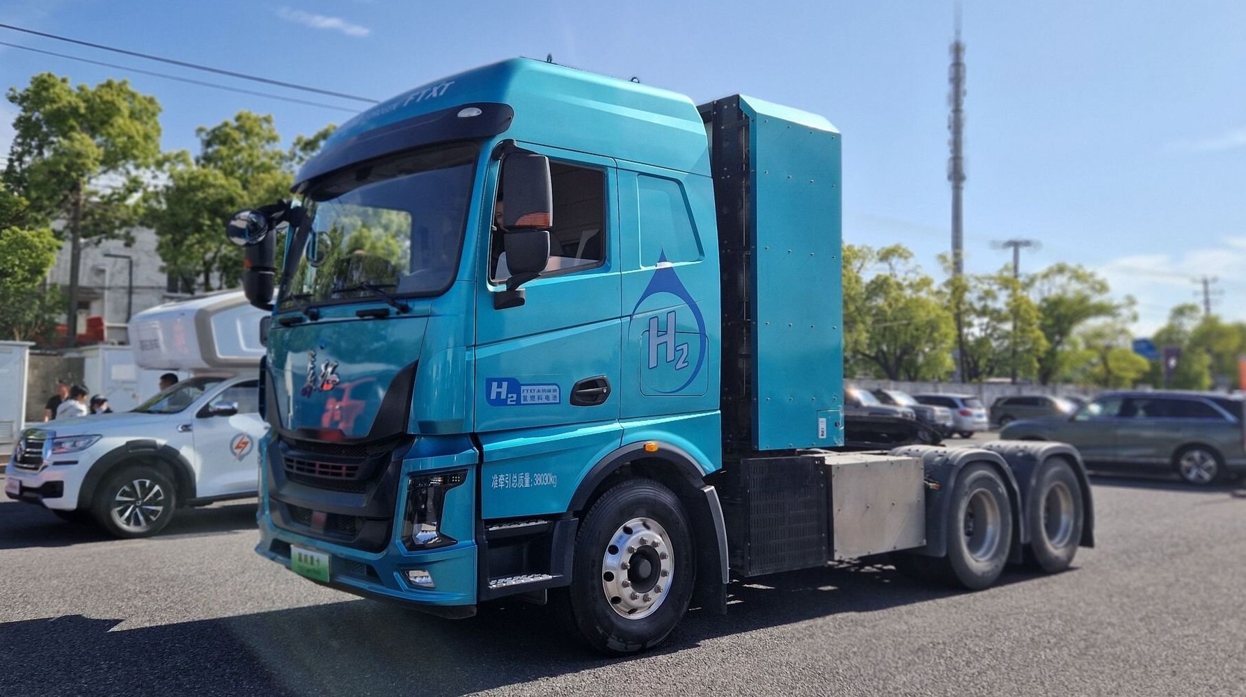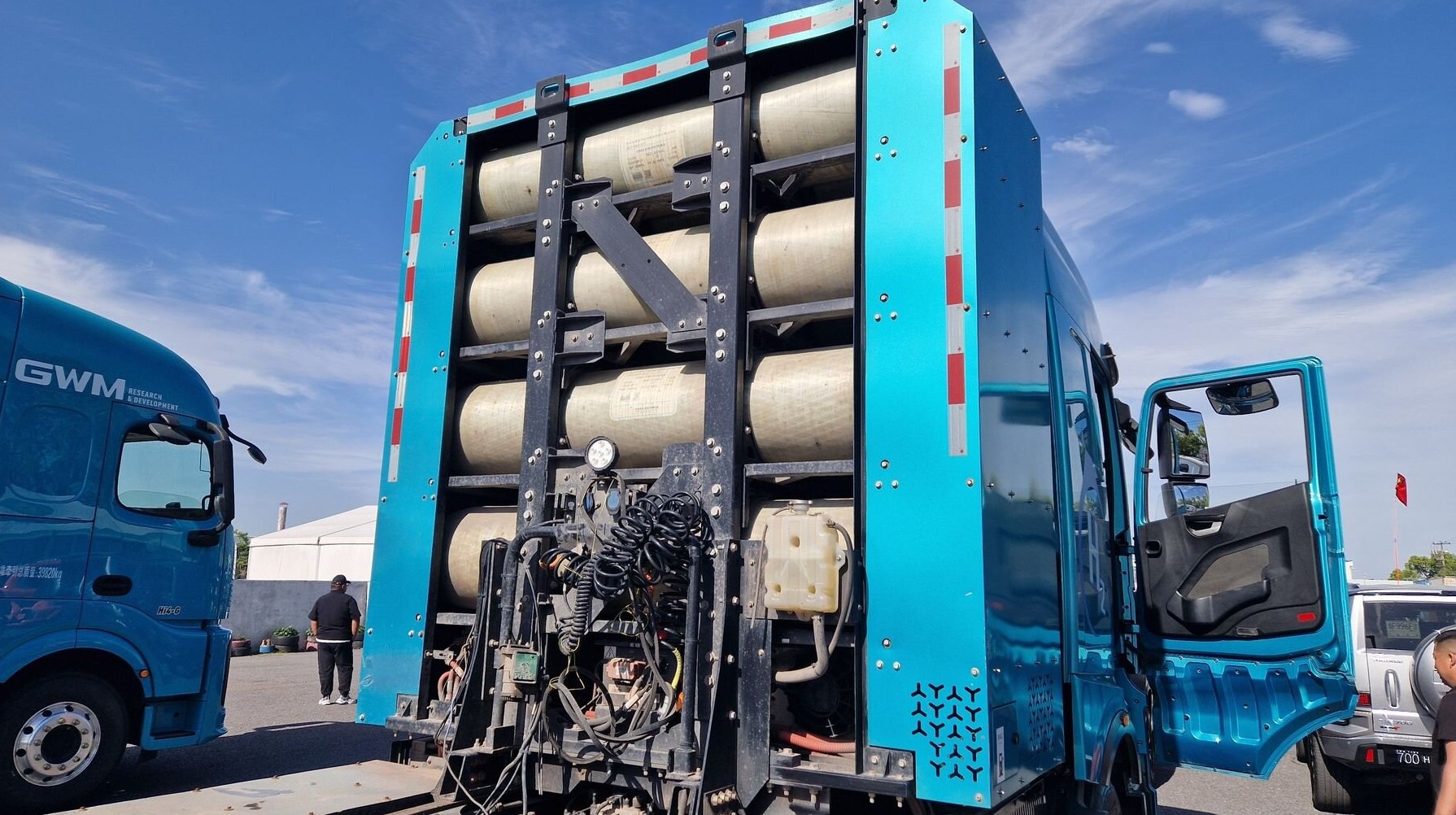 А это — тягач с водородной силовой установкой. Такие уже используются в Поднебесной для коммерческих перевозок. Баллоны с водородом располагаются в специальном отсеке позади кабины
