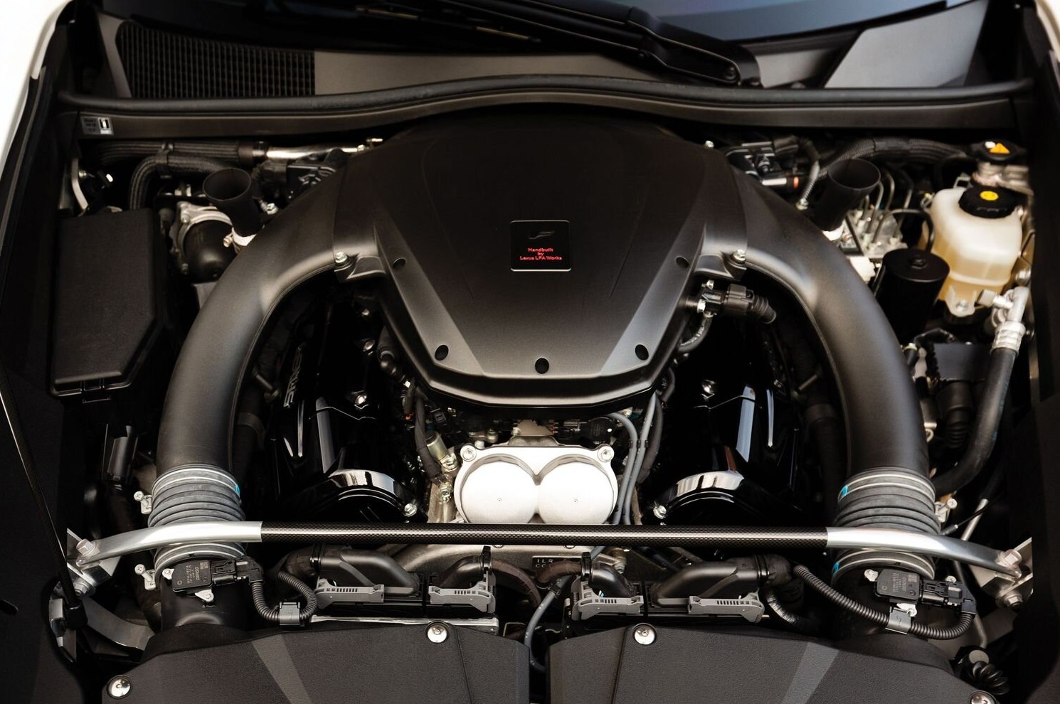 Двигатель V8 спроектирован по принципу компактности, в том числе для максимально низкой установки в шасси. Он короткоходный (диаметр цилиндра х ход поршня — 87,5 x 83,1 мм), имеет два турбокомпрессора в развале блока цилиндров и систему смазки с «сухим» картером. Точные характеристики пока не озвучены, но предварительные весьма воодушевляют. Мощность — от 650 л.с., крутящий момент — от 850 Нм. ДВС соединен углепластиковым карданным валом с 8-ступенчатым «автоматом», в котором используется «мокрое» сцепление вместо традиционного гидротрансформатора. В одном блоке с КП находится мотор-генератор и механический самоблокирующийся дифференциал.