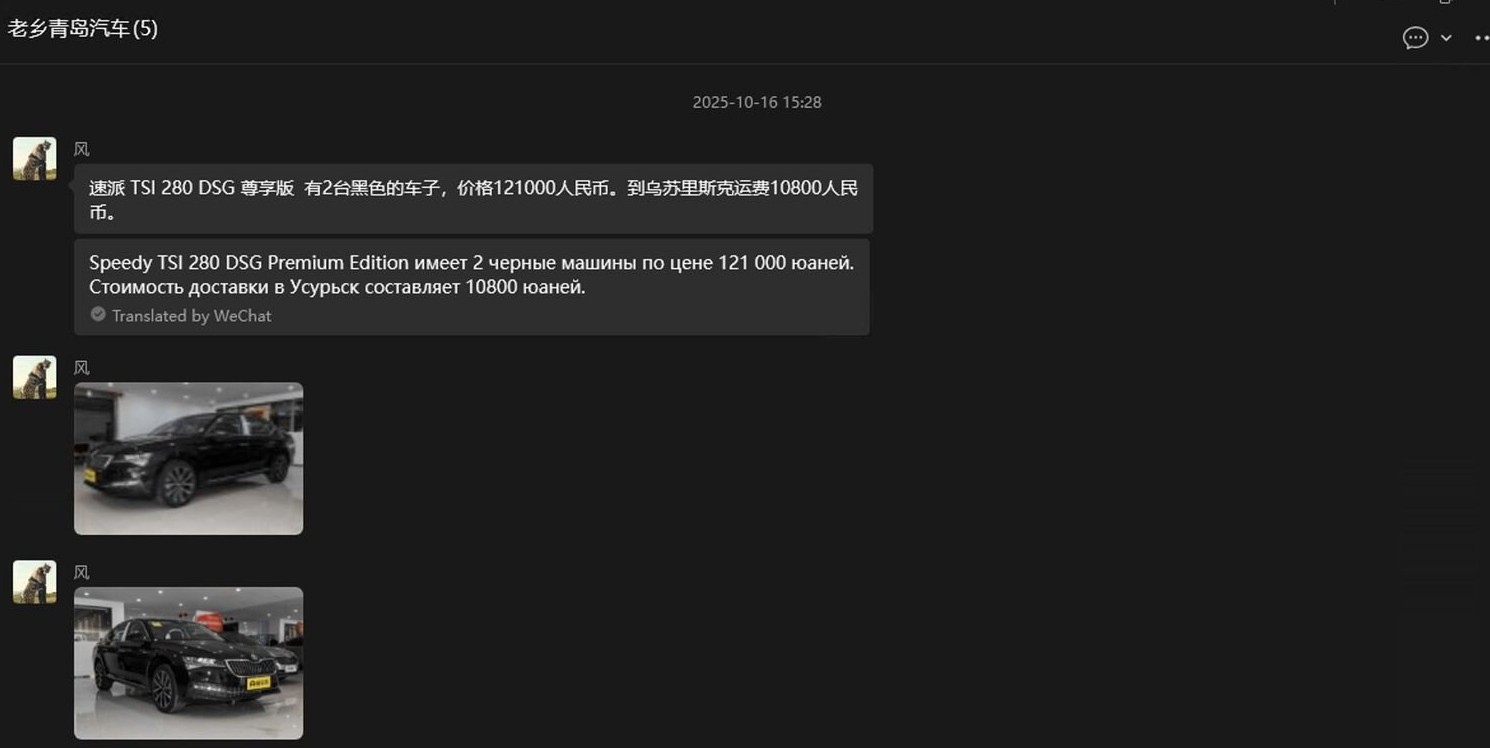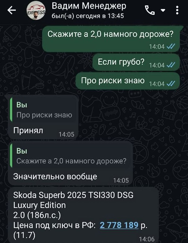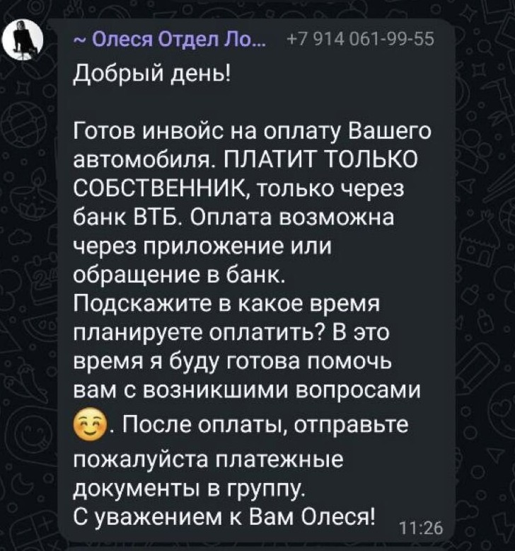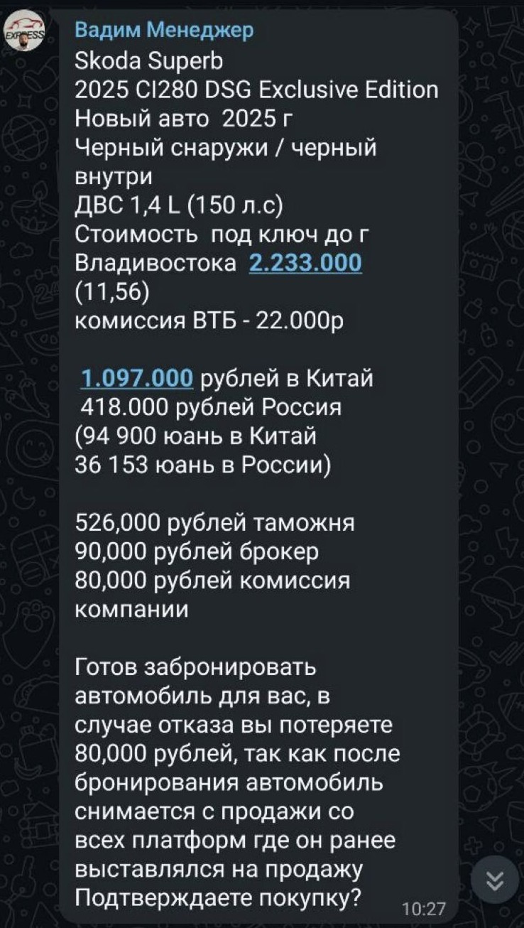 Возможные варианты покупки сбрасываются на мессенджер: описание автомобиля, его фото и базовая цена. Как только выбранный вариант клиент подтверждает, автомобиль бронируется и делается актуальный расчет покупки на сегодняшний день, включающий в себя все расходы по доставке до Уссурийска в Приморском крае.
