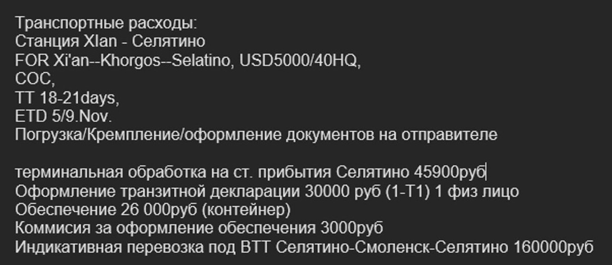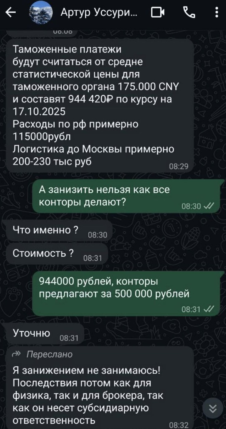 Фрагмент переписки с брокером, с которым работаем по поставке товаров (не автомобилей) из Китая