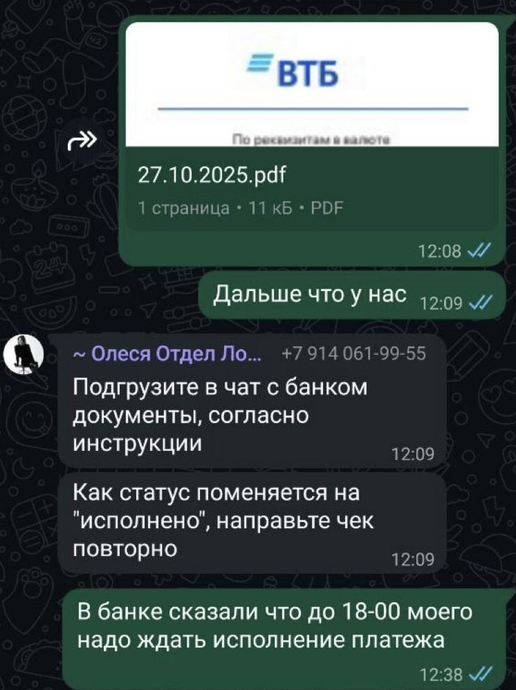 Переписка с менеджером фирмы-посредника по поводу исполнения платежа