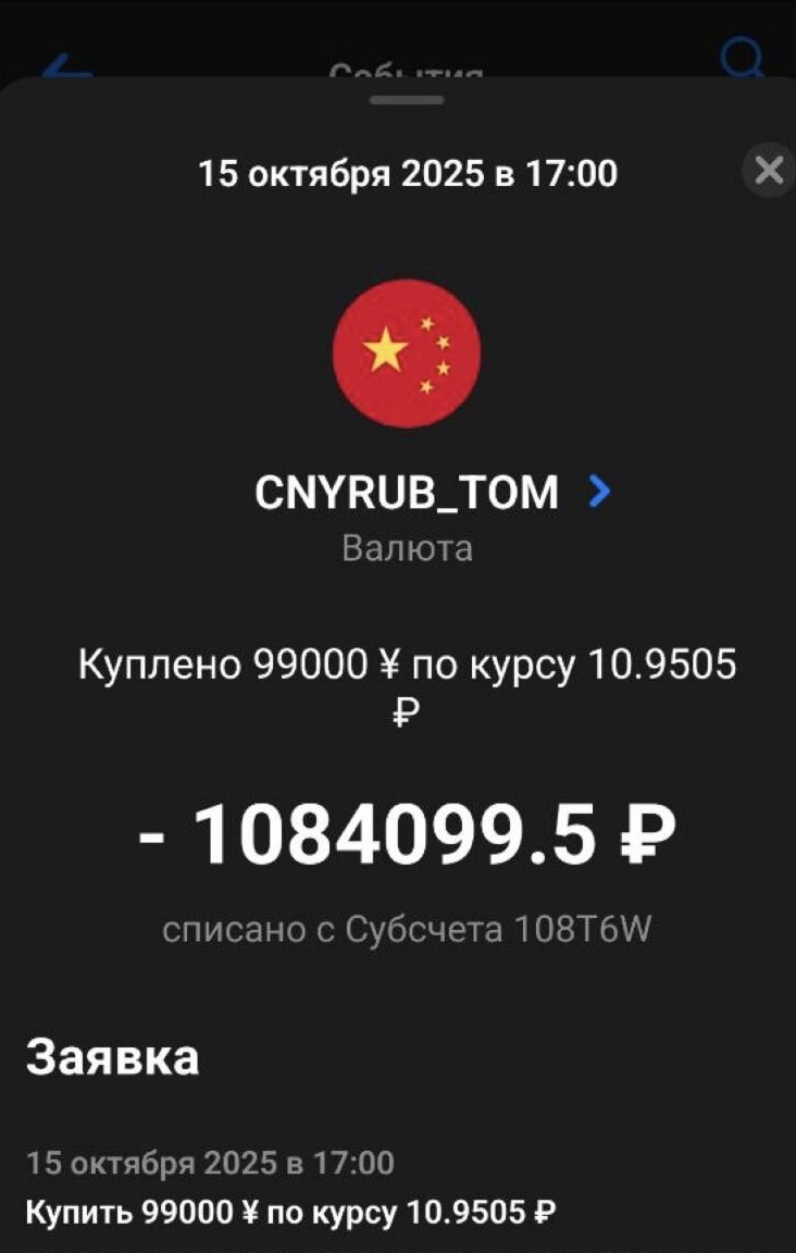 Все вырученные от продажи наличные перевел на личный банковский счет, а с него — на биржевой счет в банке ВТБ. И уже с него купил китайские юани для покупки новой машины. Повезло «поймать» удачный курс: 10,95 рубля за юань (едва ли не самый низкий за весь 2025 год; сегодня, 19 февраля — 11,01).